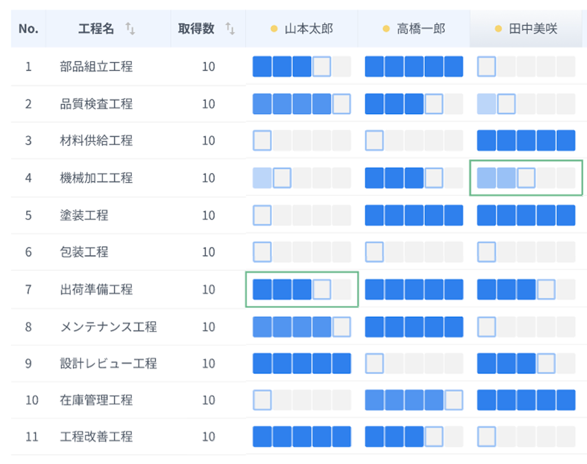 この配置最適化の根拠となっているのが、従業員一人ひとりのスキル情報を可視化した「スキルマップ」です。誰がどの工程をどの程度こなせるのか、その情報が配置の判断材料になります。