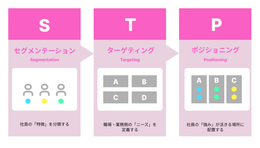 そして今、この“人材配置の戦略化”において、マーケティングの代表的手法「STPフレームワーク」が応用可能であることが注目されています。顧客に対して使われてきたこの枠組みは、実は「社員を理解し、最適な職務にマッチさせる」という人材配置にも応用できるのです。