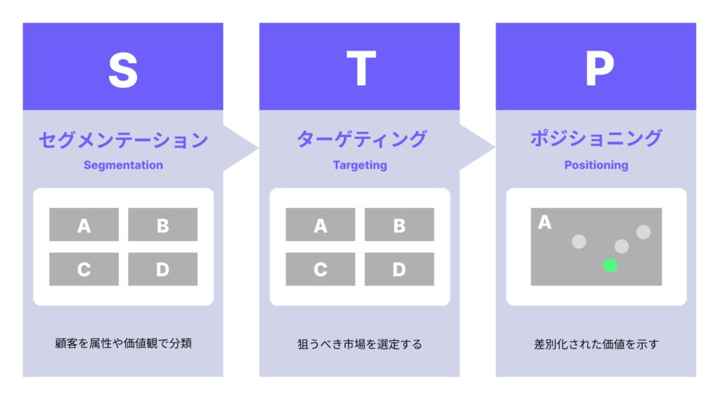 STPとは、Segmentation(セグメンテーション)、Targeting(ターゲティング)、Positioning(ポジショニング)の頭文字をとった、マーケティング戦略の基本中の基本とも言えるフレームワークです。