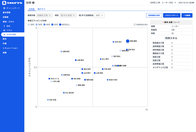 スキル・資格を年代・班・属性別にグラフ化。熟練層に偏った工程を特定し、将来の技能喪失リスクを早期に把握。